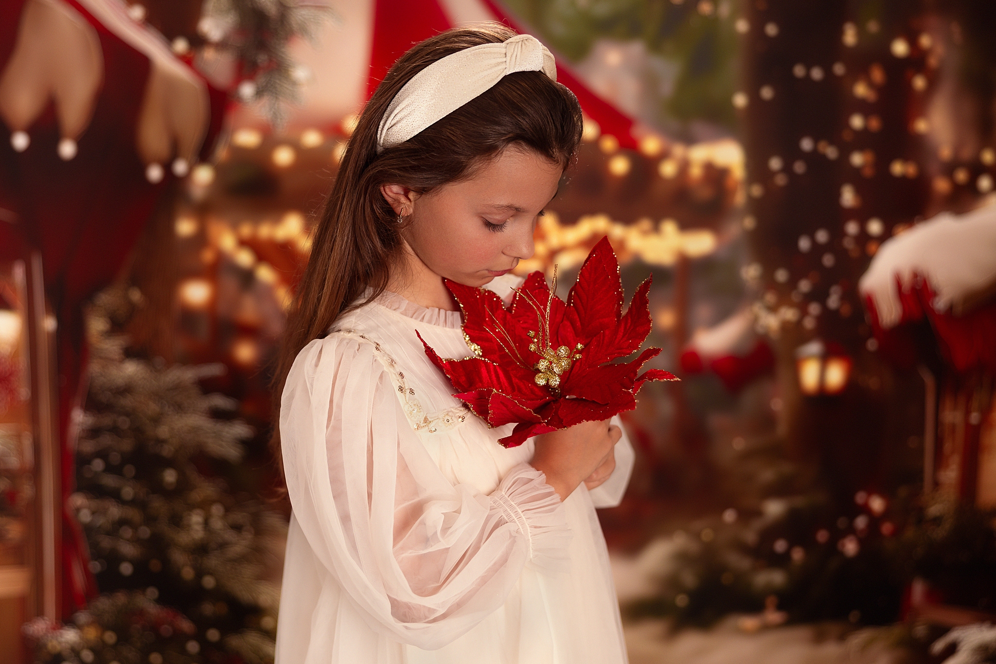 Deze setting ademt pure kerstsfeer: klassieke rood- en groentinten, fonkelende lichtjes en een vleugje sneeuw. Alle props die je ziet, zijn uiteraard aanwezig in de studio.